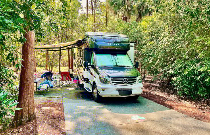 This RV rental provides a stationary, hassle-free option for cruise travelers, located just 10 minutes from Port Canaveral and 30 minutes from Orlando International Airport, ensuring easy access to your cruise departure. With the added convenience of electric and water hookups right in the driveway, your arrival and departure days are simplified, offering a comfortable and stress-free experience