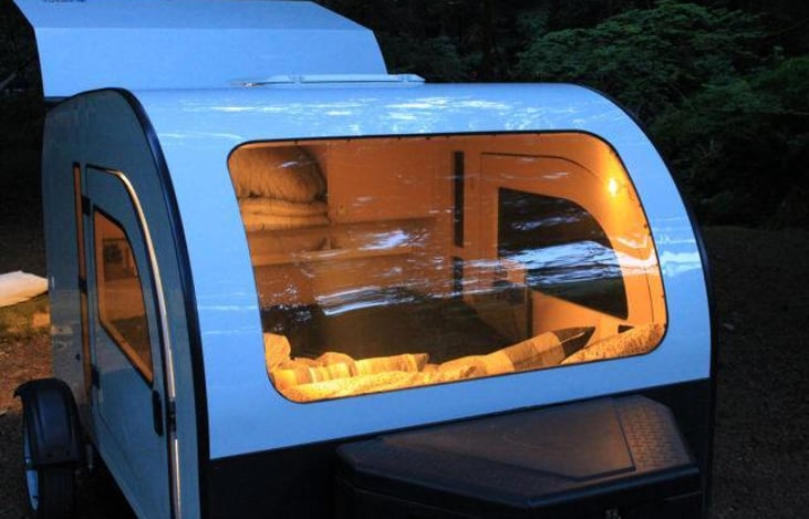 Treat yourself to a vacation in this unique Droplet trailer! At a 950 lb dry weight, this trailer can be towed by most vehicles. Feel secure with interior/exterior locking doors. It sleeps 2 on a comfy queen-size mattress with large doors, tinted windows and ample storage space. It comes with a battery pack that powers the fridge, lights and power station inside the camper.