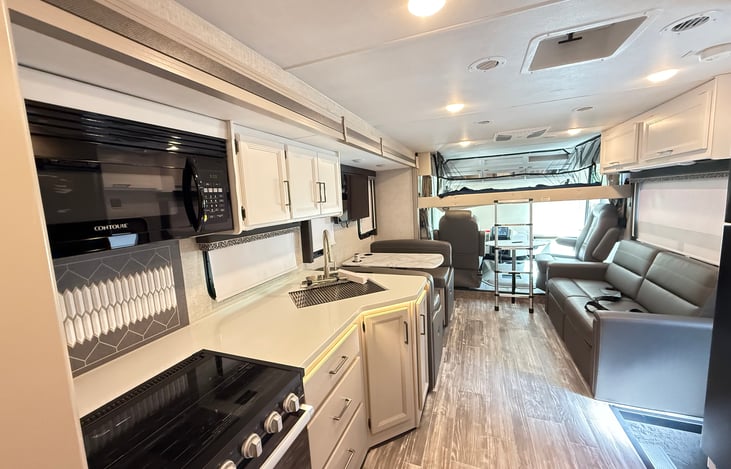 Class A gas motorhome perfect for family adventures. It sleeps up to 8 (seat belts for 6) with a king bed, drop-down overhead bunk, bunk beds, sofa bed, and Dream Dinette. Sheets and comforters included (Bring your own pillows). Enjoy a full kitchen with a residential refrigerator, three-burner cooktop, and microwave, added large airfryer, plus an exterior kitchen for outdoor meals.