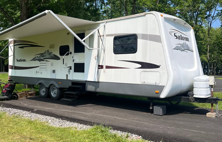 Very spacious camper. It features 2 slide outs, master bedroom,bunks in back, table turns into a bed as well as the couch. Has a microwave, full bathroom, hot water,heat, and air conditioning. Camper is on the heavy side, so if we don’t set up, we recommend a 3/4 ton truck. Includes weight distribution hitch. Comes stocked with linens, dishes and cooking utensils.