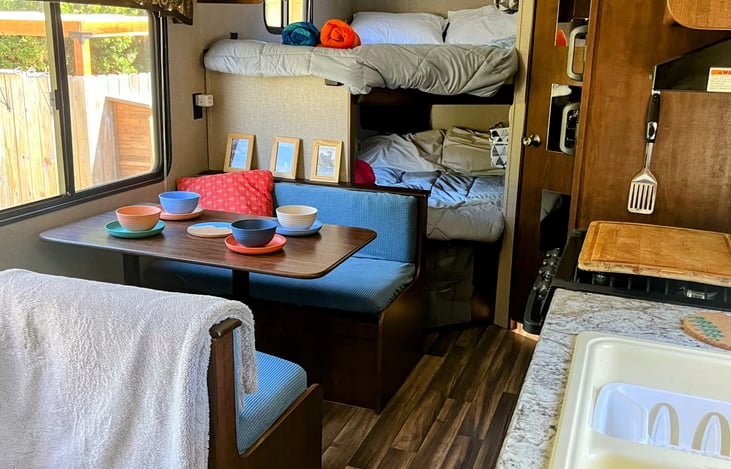 This RV is perfect for families! The full-size bunk beds sleep four kids. A queen-size murphy bed with new cushy foam mattress saves space while ensuring grown-ups are comfortable too. The trailer is well-outfitted with everything from bedding to travel games. The clever layout ensures everyone has space, and the trailer is compact and manageable for easy parking and towing.