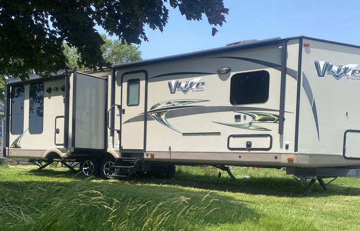 Spacious RV with great amenities. This is perfect for a couple for longer stays or for family camping with a large living space for kids to sleep as well. Queen size bed and closet space in the bedroom. The living area includes a fold out couch, 2 recliners, and a table. The kitchen is stocked with utensils, pots, pans, etc. The linens can be provided as well.