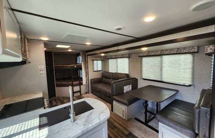 Plan your next escape or special event in our super clean and meticulously maintained 28 ft travel trailer, which sleeps up to 9. This spacious camper features a private queen bedroom, convertible dinette, fold out sofa, and two sectioned-off double bunk beds. It also comes equipped with all the essentials (bedding, towels, cooking basics, entertainment and more!) for a comfortable experience.