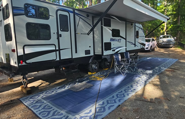 Delivery only. This camper is loaded. Comes with outdoor kitchen. Black stone griddle. Pittboss pellet grill. Towels. Bedding. Keureg, air fryer, pots and pans, silverware, outside mats, chairs, electric griddle..