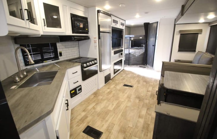 Beautifully designed with both adventure & comfort in mind! Sleeps 8-10. Fireplace with a hidden pantry, outdoor shower, fridge, cooktop & stocked with everything you need and more! Flexible delivery and pickup!
