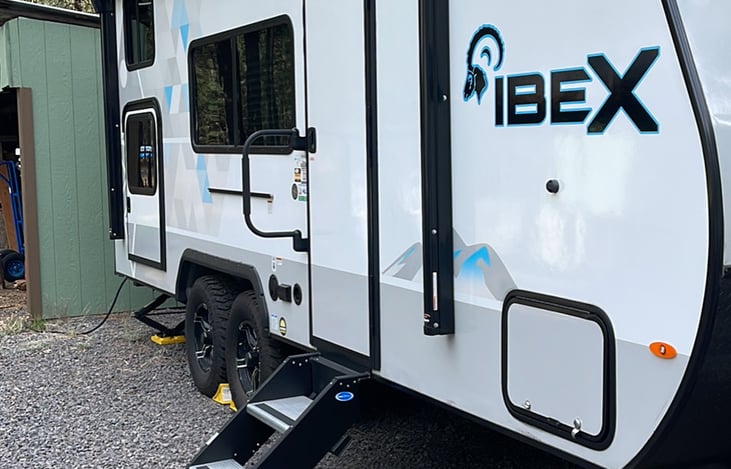Forest River Ibex 19MBH that sleeps 5. Super family friendly with a queen bed, two double bunks, and a twin dinette bed. Equipped with a kitchen, toilet and shower in the bathroom, and a hose connection by the door for easy access to spray off your shoes or feet before coming inside! Stocked with utensils and plates for easy dining.