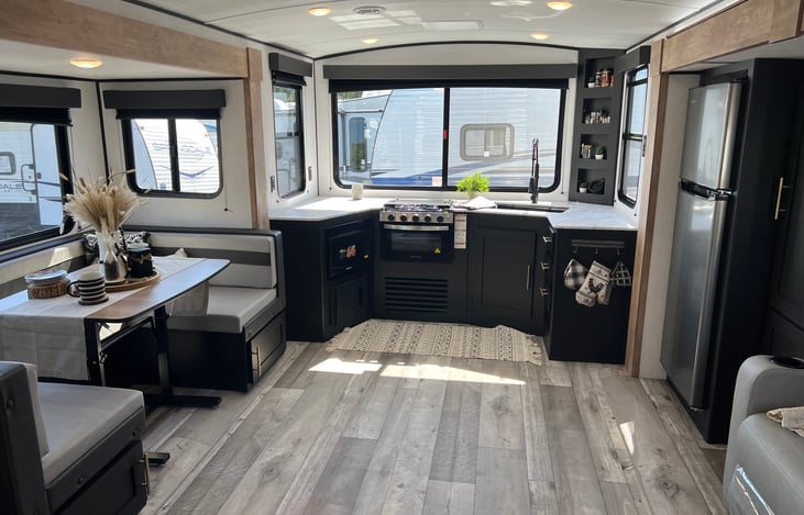 Step inside our luxurious RV with a sleek design to find an incredibly spacious living area. With slide outs across from one another your living space gives you plenty of room to relax and enjoy whatever view you choose with several windows across all sides. The recliner seating is very comfortable and make for the perfect afternoon naps.