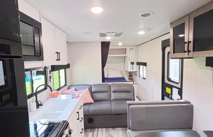 Explore the beauty of Idaho and the surrounding national parks with this brand new 2025 camper! It can comfortably sleep eight adults but you can fit as many as ten people! It features a queen bed, a convertible sofa and dinette table, and double size bunk beds that hold up to 600 lbs each.