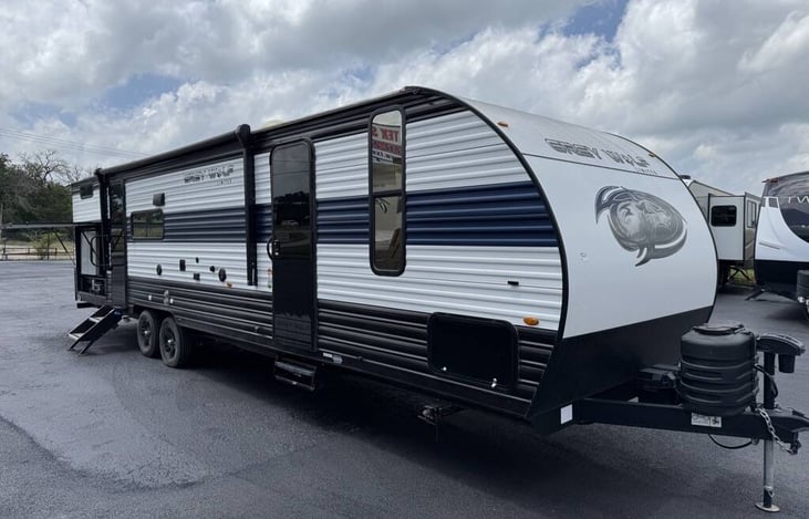 This is a 2023 Forest River Cherokee Grey Wolf 29TE in pristine condition. It has an outdoor kitchen with full sink/faucet, refrigerator, freezer, cabinet space and a pull out Greystone outdoor cast iron griddle. It is very spacious and can easily sleep up to 9 people. It has a fresh water tank, a grey tank, and a black tank. There is a TV in it as well.