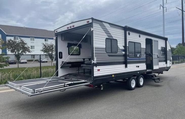 Toy Hauler includes modern amenities, fridge, microwave, stovetop/oven, corner shower, linens, basic cookware, TV, AC, heat, large table, party deck and other necessities for your adventures. Large awning, outdoor stereo system, outdoor shower.