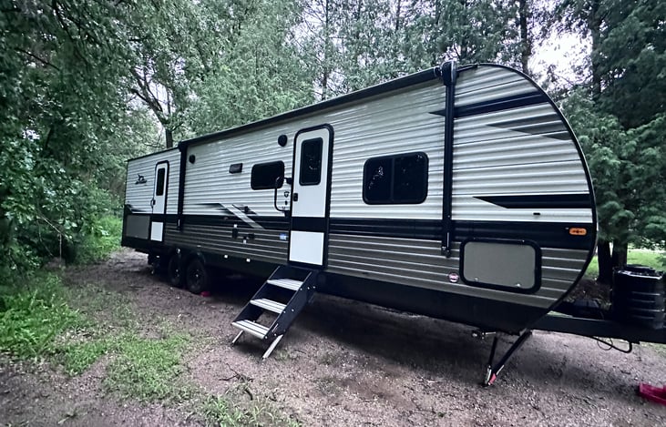 Our spacious and comfortable Jayco travel trailer can meet the fun and functional needs for your next camping adventure. This trailer sleeps up to 10 with a rear bunk room featuring 3 bunks with safety rails and a bench/table that also converts to a bed. A U shape dinette and reclining couch make the living space comfortable for days when the weather doesn’t cooperate.
