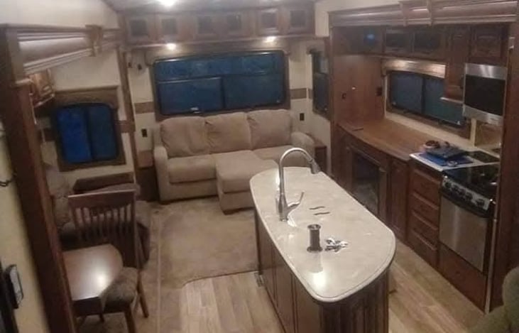 This spacious camper is loaded with features for comfortable living or extended trips. It includes a washer and dryer, a large closet pantry, and a full-size residential refrigerator. Enjoy two TVs, a cozy fireplace, and three slide-outs that offer plenty of room to relax. The kitchen is fully equipped with a stove and oven, and there’s even a fire ring outside for evenings by the fire.