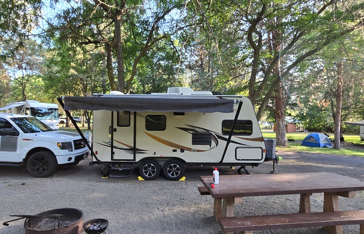 Comfortable 21' camper can accommodate up to a family of four with the couch converting to a twin bed and a drop down twin bunk above the queen bed. It comes equipped with bedding, bath and hand towels, cookware, utensils, silverware, and a French press for making coffee. Just bring your paper plates, bowels, and cups.