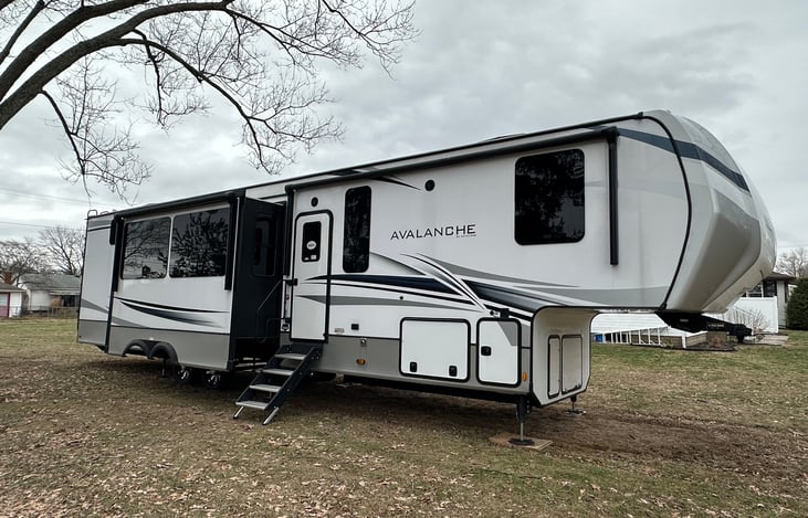 This is a 43-foot, 2 bedroom, 2 bath, 2023 Keystone Avalanche 390DS with a beautiful modern interior. Luxury vinyl flooring, and plenty of bells and whistles. The kitchen is equipped with an island with dual sink, oven, cook top and full-size residential refrigerator/freezer. Cooking utensils, cookware, dinnerware, toaster and coffee maker provided.