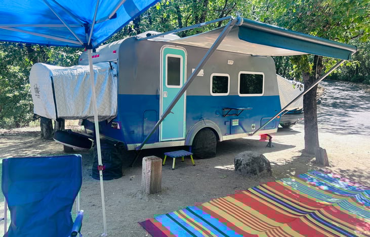 When we arrived, the trailer was completely set up—easy-up, chairs, and mat all in place—so we could jump right into enjoying our trip.