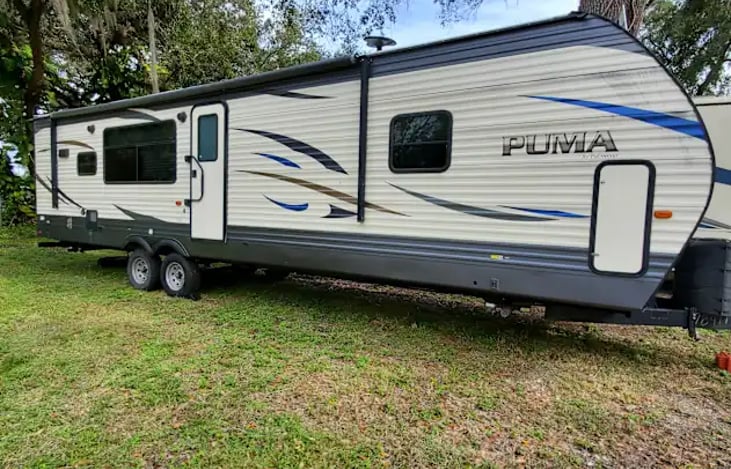Hit the road in style with this roomy 2019 Palomino Puma 32RKTS! With a private master bedroom (queen bed), rear kitchen, full bath, and a large living area with slide-outs, it comfortably sleeps up to 6. Features include a fully equipped kitchen, cozy dinette, sofa sleeper, and ample storage—ideal for families or longer trips.