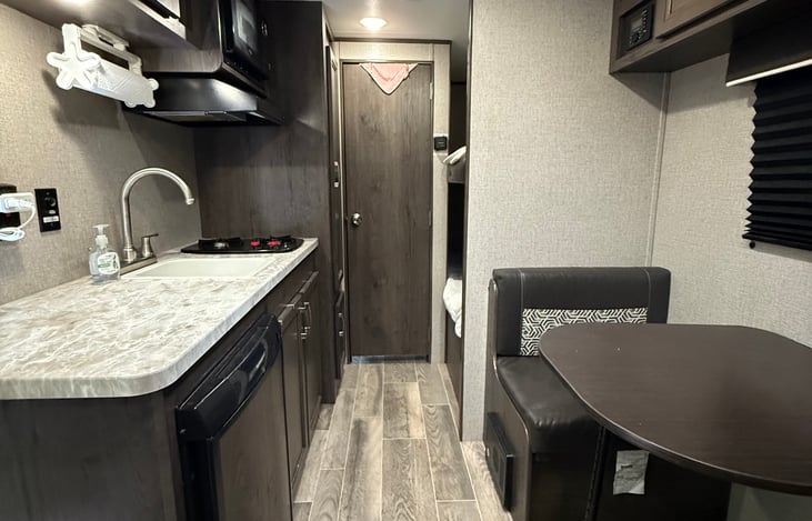 The perfect camper for a getaway! You'll have a great adventure no matter where your plans take you! This camper comes with a queen sized bed and two twin xl in bunk formation. You will have all the luxuries of home with a two burner stove, fridge/freezer, a/c and heat, full bathroom with toilet and tub/shower combo., and a 2 seater dinette.