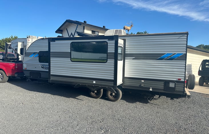 This RV is a cozy, well equipped retreat on wheels. Perfect for couples, solo travelers, and families. The kitchen and dining area are open and spacious with a large pantry for storage. The kids love the bunk beds and the parents love the outside fridge and flat top grill.