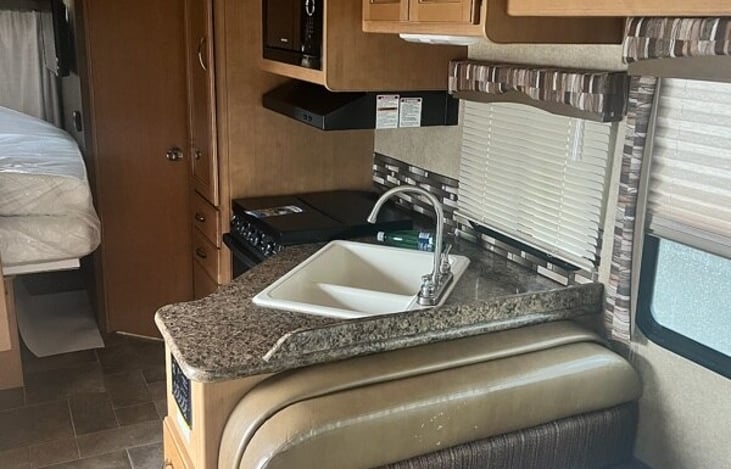 Our RV sleep 6 people! Queen size bed, the couch folds out into a bed, the dining room table is also a bed. Two TVs. Comes with pots and pans, silverware.