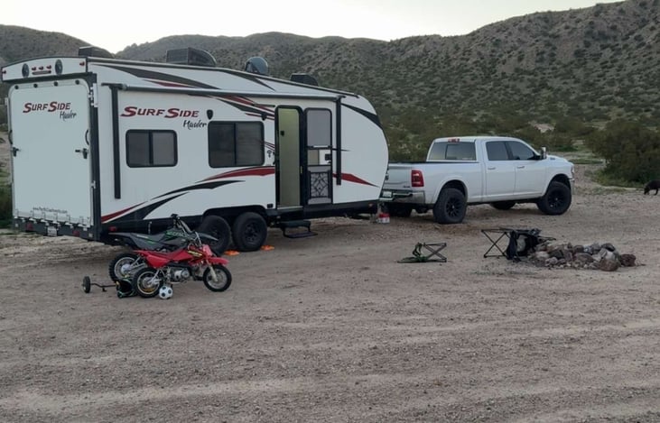 We have 5 kids and love to go camping. We have this smaller trailer for guys trips, girls trips or just the two of us to get away. When we camp with all kids we have our 40’ trailer. You can usually find us in the dunes or out at Cal City.