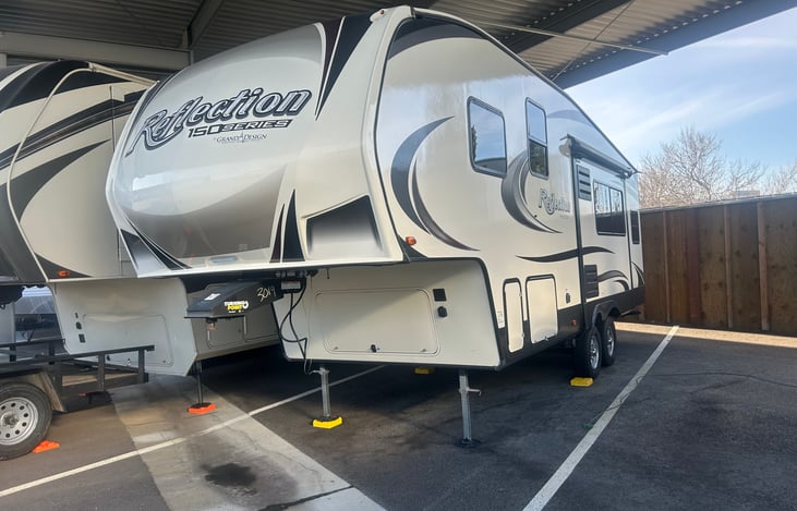 5th wheel RV lightweight with fridge, microwave, indoor outdoor speakers, smart tvs, dinette bed conversion, queen bed, pull out sofa, and local satellite, heat and AC.