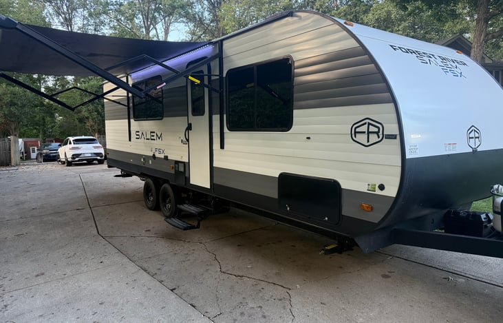 The Forest River Salem FSX 266BHLE is a travel trailer designed for comfortable family camping, sleeping up to 8 people. It features a double over double bunkhouse layout and a private front bedroom with a king-size bed including sheets and pillows, dual wardrobes, a full bathroom with a 36" x 24" shower, and a mid-kitchen design maximizing space.