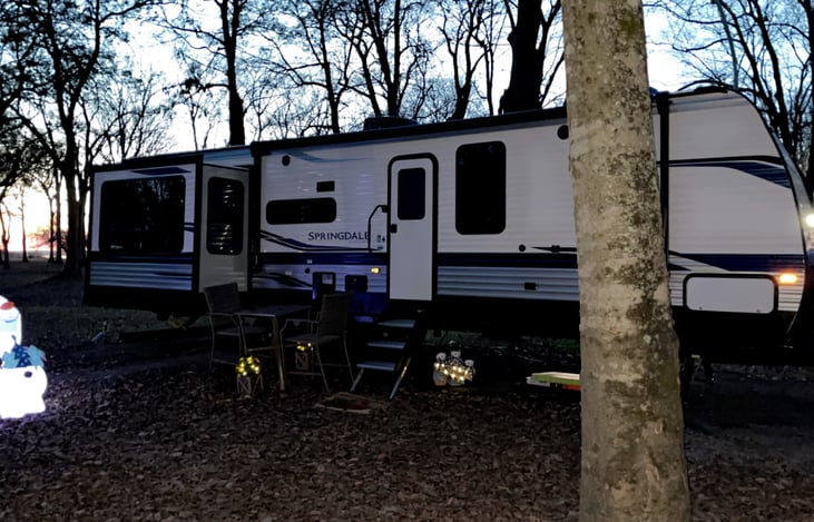 Hello everyone, I bought this 2022 keystone Springdale pull behind brand new I lived in it full time for work traveling and I no longer use it for work so I am here to list it to keep the life going on it . It had one bedroom queen bed storage under bed closet , tv on the wall . One bathroom the booth dining table can lay down and make a bed so can the couch .