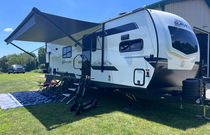 If you are looking for a way to enjoy outdoor adventure with luxury amenities...Blue Peaks Rendezvous is loaded with updates and ready to roll! We offer delivery for this 2024 Forest River Grand Surveyor, and it is fully loaded with a power jack, 2 - 40 pound propane tanks, 400wt solar panels, small outdoor kitchen with grill, refrigerator and wash bin.