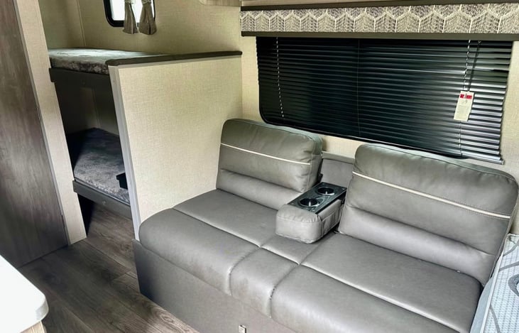 Plan the perfect getaway in our 2023 Coachmen Catalina travel trailer. This trailer sleeps 5 comfortably with a queen bed, full jackknife sofa and two bunk beds (suitable for kids, small teens only). The trailer has a roomy shower, flush toilet, 2-burner range, microwave, good size fridge and freezer, JBL sound system, power awning and outdoor night lights.