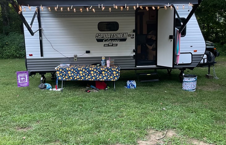 this small, but mighty camper has everything you need for a weekend trip! sleeps 5-6. equipped with a fridge, freezer, stove, microwave, shower, and sink; both cold and hot water provided. pillows, sheets, and blankets provided, we ask that the renter bring towels and toiletries. the large dinette in the slide out provides seating for 4 and extra space in the kitchen area.