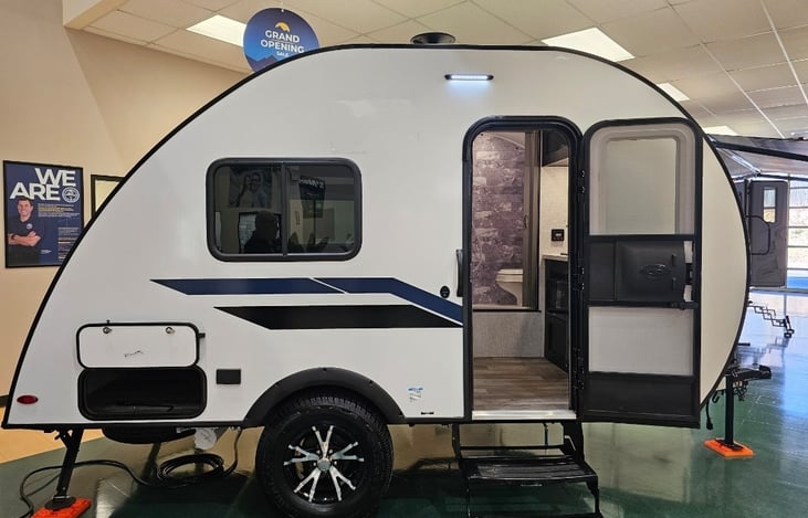 The perfect camper for a new glamper! Light & compact design, easy to tow. New condition. Kitchen, propane stove, sink, microwave and 3-way refrigerator runs on electric, propane or battery. U-shaped dinette/queen-sized bed (new quilt, new pillows and linens included). Wet bath with shower and toilet (new privacy curtain added). Blue-tooth stereo and tv antenna.