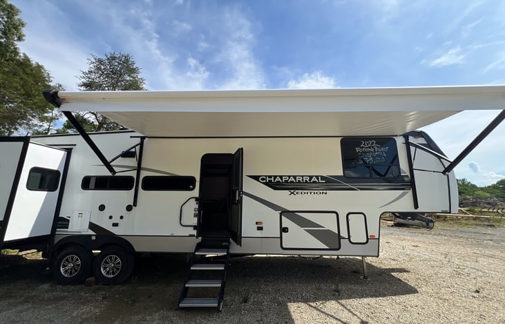 Welcome to The Grand Camp Lodge, a spacious and luxurious 2022 Coachmen Chaparral 355FBX fifth wheel designed to bring the comfort of home to the campground.