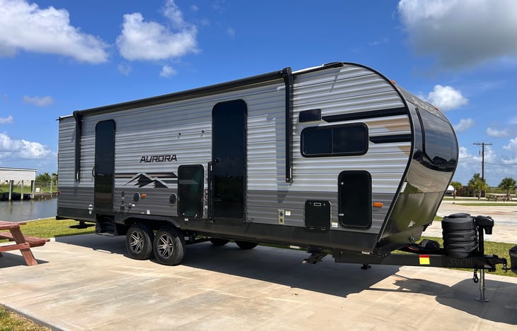 The Aurora 26FKDS is beautiful and the perfect travel trailer to enjoy! The Aurora is almost 30’ with an 18’ power awning.
