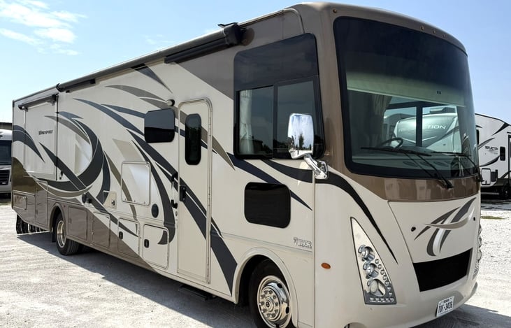 2017 Thor Windsport 35M Calss A motorhome with tons of space. Sleeps 8, overhead front bunk that lets down for 2, dinette conversion sleeps 2 small kids, L shaped sofa fold bed sleeps 2, and master king bed in back. Half bath mid bath and full rear bath. Outside TV, living area TV, and bedroom. Auto leveling jack for easy set up.