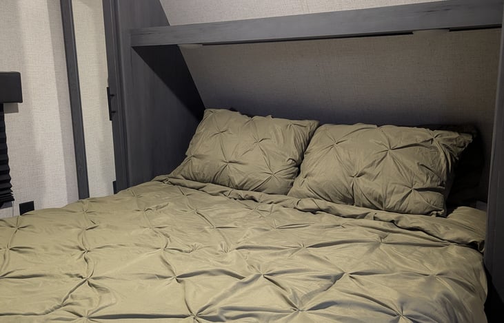 Looking to camp with privacy and plenty of space? Look no further! Inside you'll find a beautiful kitchen and living room with an extra large slide, plus two bedrooms! There is enough sleeping space for 8 (sleeps 5 adults comfortably). Delivery available.