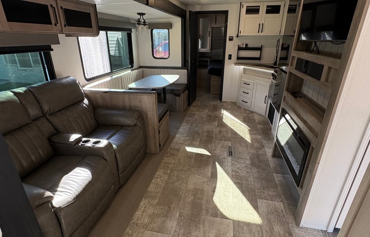 Our camper is roomy but cozy, functional and practical! The main room has a queen bed with two small closet spaces and additional storage. There is a “bunk room” with three bunks and an additional closet and cabinet!