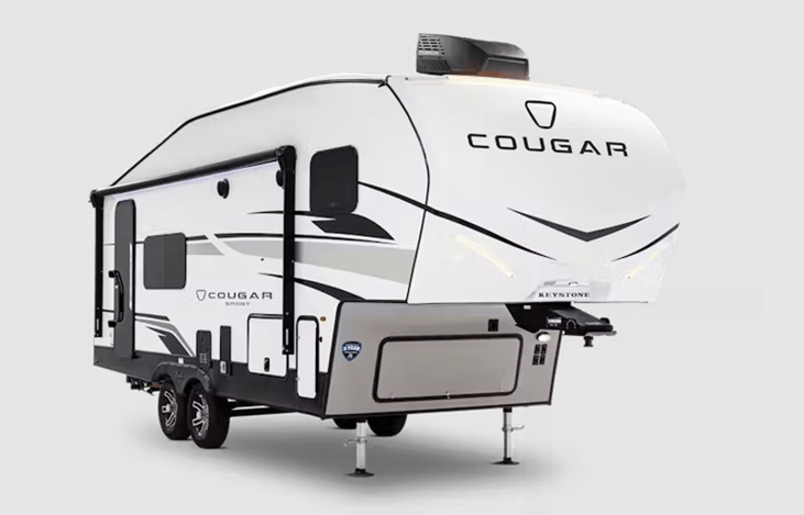The Keystone RV Cougar Sport 2100RK is a compact fifth-wheel trailer known for its rear kitchen layout and lighter build, making it a suitable choice for couples or small families.
