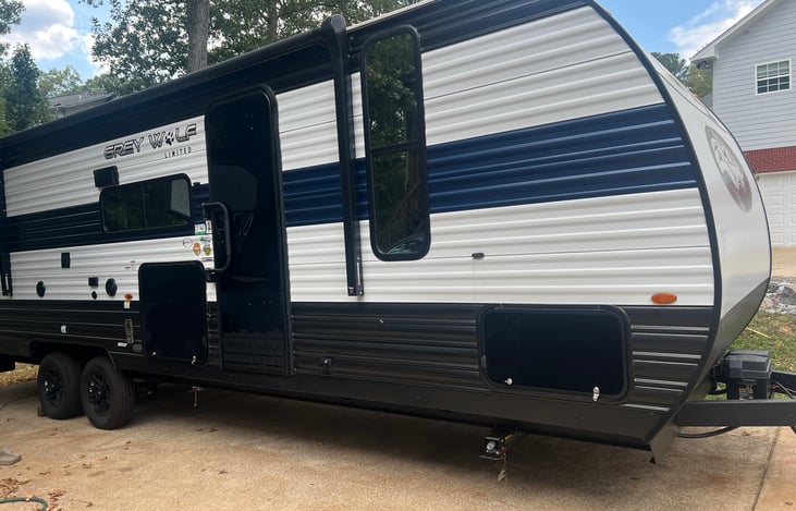2024 grey wolf bunk house. It’s 32 ft long and is practically brand new. Hasn’t been camped in hardly at all. Very nice unit. Has a bunk bed in the rear. Queen bed in the front. Dinette makes into a bed as well as the sofa. Stove top and air fryer convection oven combo. Outside cooking area with fridge. Has solar panel on top along with inverter. This option will no run the A/C unit.