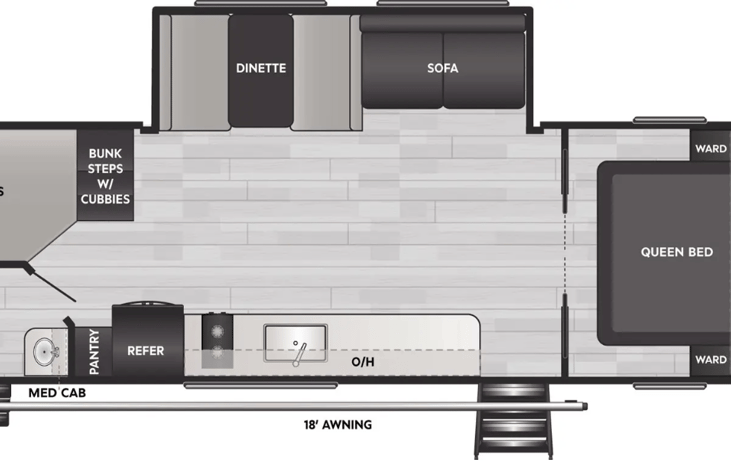 Welcome to your second home! As you approach the camper, you'll notice the charming double entry doors. Step through the main door and ascend three stairs to the main deck, where you'll be greeted by a spacious and open kitchen and entertainment area, complete with all the necessary amenities. Behind the kitchen, you'll find the bathroom, which conveniently has a second entry door leading outside.