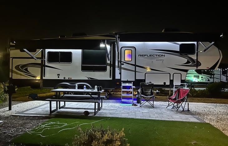 Spacious Family Ready Fifth Wheel. Experience comfort, style and convenience on your next getaway. Large slide out living area and modern kitchen with island, full size fridge and microwave/stove. Sleeps 6-7 people. Pull out sofa in the living area that sleeps 2. Bunkhouse that sleeps 2-3. Master bedroom that sleeps 2.