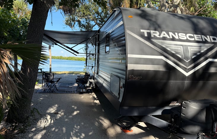 Grand Design Transcend Explorer, 297QB, 36 feet, sleeps up to 9, queen size bed, separate bunk room, theater seating, kitchen utensils, camp chairs, outdoor mats,