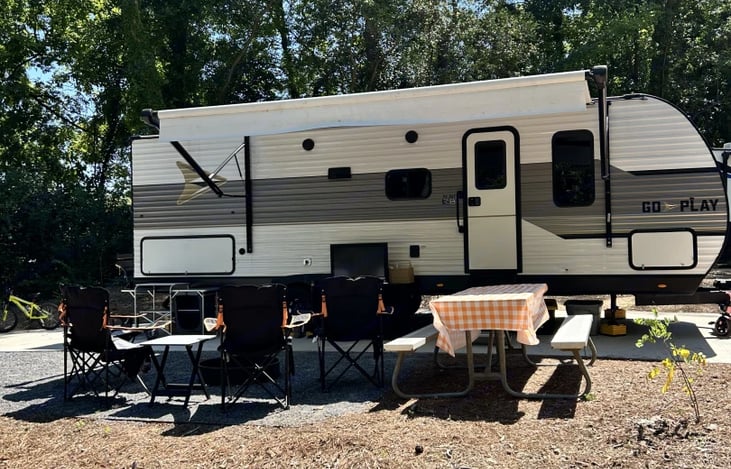 Enjoy the perfect family getaway in this spacious and modern 26-ft travel trailer with a slideout! Sleeps up to 6 comfortably with a private queen bed suite, double-over-double bunk beds, a jack-knife sofa, and a convertible dinette. Plenty of space to relax indoors after a day of outdoor activities.