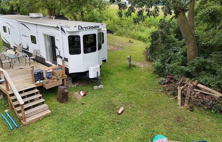 Our Camper is onsite at our lot on Lake Elysian. The spot is private and secluded right outside of Elysian MN. Right accross HWY 60 from The Sakata trail.