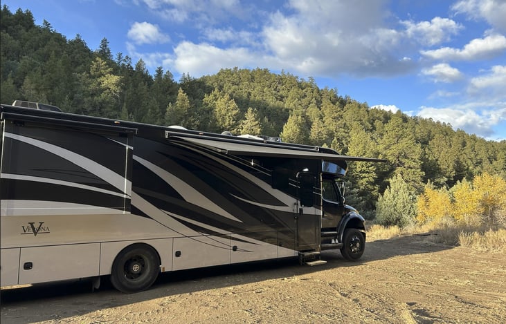 Black on Black Renegade Super C - StarLink In Motion for all Stream Guests can be Entertained While You Cruise - 100 Gallons of Deisel Fuel - 600 + Miles of Range - Living and Bedroom Slide Outs- Queen Bed over cab W/TV - Queen Fold out couch in Living area W TV - Dining area folds down for smaller bed for kids or shorter folks - Queen Bed in back room that slides out W TV - Full size Fridge - Ov