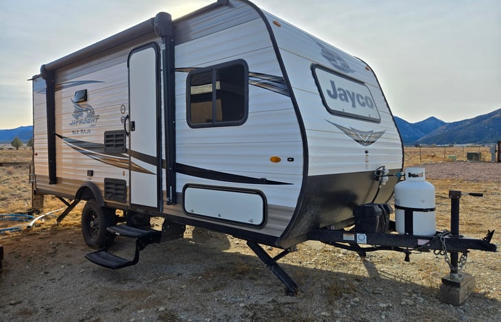 Enjoy an easy comfortable getaway in our sub 3000 pound 2020 Jayco JayFlight Baja SLX 174 BH that sleeps up to 5. It's very easy to tow with most SUV's or pickups. It has a Queen main bed with a thick comfortable mattress, 2 bunks and a dinette that folds down for a smaller person to sleep. A toilet, shower, cooktop, microwave, dorm-sized fridge with freezer, a furnace and an A/C unit.