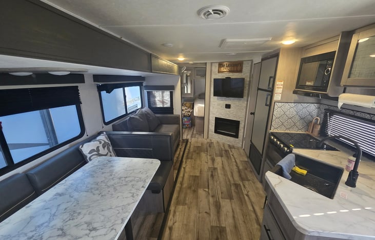 Full kitchen, bathroom with shower and toilet. Cozy indoor fireplace, bunk beds, dinette converts into a bed, separate room with a queen bed. Basic cookware and utensils, kettle and Keurig, TV and ice maker. To enhance your camping experience, we have provided a gas firepit, a griddle and foldable table and chairs.