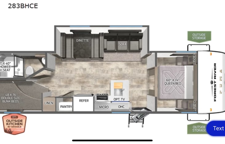 Brand new Palomino Puma sleeps 8 comfortably. Has one slide out for a big living and dining area. Has a 32 inch tv and a built in radio with speakers inside and out. The kitchen comes equipped with propane burners, microwave, and a large fridge/freezer. There is also an outdoor kitchen with a propane flattop grill, sink, and mini fridge.