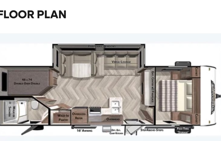 Family-focused travel trailer with a, roughly 31’5” length, featuring a front private bedroom with a custom queen bed, rear double-over-double bunk beds, and a large slide-out. Inside, it features a U-shaped Versa-lounge/dinette, a 10.7 cu. ft. stainless steel refrigerator, and a fireplace.