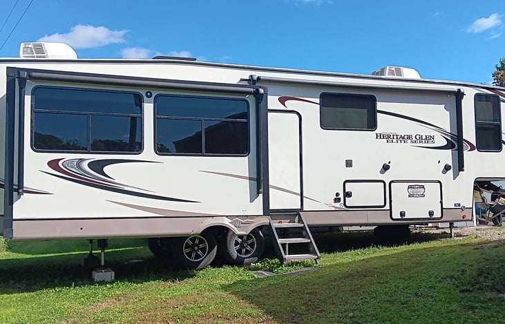 Beautiful spacious fifth wheel with panoramic views and very spacious. Full size kitchen with island and appliances. Pull out bed and couch and two lazy chairs to watch TV with a fireplace and radio plus radio outside. Walk up stairs double sinks with shower . Upper level large king bed and storage . Outside shower. Also awning outside and speakers to play music and enjoy