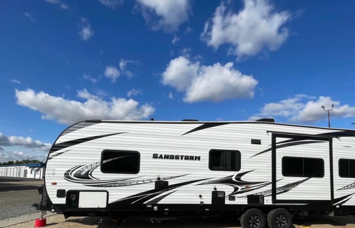 Experience the perfect mix of comfort and adventure with our 2020 Sandstorm Toy Hauler! This spacious and fully equipped trailer is ideal for families or groups looking to enjoy the outdoors without giving up the comforts of home.